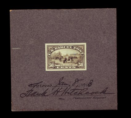 872 E Q10-E4 image#Q10-E4, 50c Dairying model essay of incomplete engraved design, being a black photograph of incomplete engraved design (no vertical lines on frame around top corners or in numeral circles), mounted on thick gray cardboard measuring 99x94mm, approved and signed by the Postmaster General on Jan. 8, 1913, very fine and unique; ex-Doolittle. (Image) 2,500.00