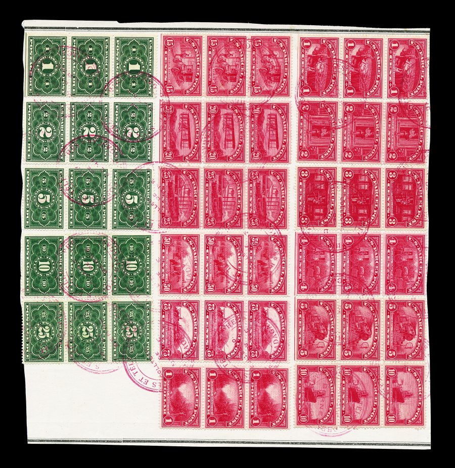 878 S Q1S-12S, JQ1S-5S image#Q1S-12S, JQ1S-5S, 1c-$1.00 Parcel Posts and 1c-5c Parcel Post Postage Dues Madagascar "Specimens", a remarkable and unique page extracted from the official Madagascar Post Office archival record book of stamps submitted by foreign governments to use as "Specimens", this being an official record of stamps that the government can expect to see on mail addressed to Madagascar, consisting of vertical strips of three of all values from both the Parcel Post and Parcel Post Postage Due sets, all tied to a large part of a page from the archival book by large red double circle official Madagascar P.O. handstamps, very fine; this remarkable Parcel Post showpiece is unique and would be the perfect centerpiece of an award-winning exhibition collection. (image 878a) (Image) Est. 3,000-4,000