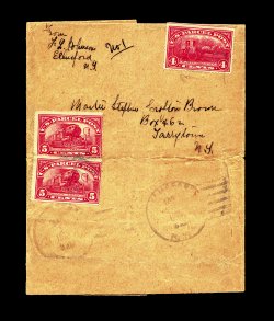 961 F Q4, 5 image#Q4, Q5, 4c and 5c Parcel Posts, a single of the former (natural s.e. at top) and two of the latter (both centered to right) all tied to an incredible January 1, 1913 combination first day cover, being a very large packing wrapper that has been cut down and folded for display purposes, stamps tied by multiple strikes of light but easily readable "Elmsford, N.Y./Jan 1/1913" handstamped cancels, addressed to Tarrytown, N.Y., the piece has several flaws (just affecting the 5c stamps), but is of little consequence considering this cover's important significance; one of only five recorded combination January 1, 1913 first day covers of any kind, and the only one bearing this particular combination of values; 1987 PF certificate. (Image) Est. 3,000-4,000