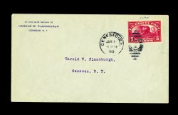962 F Q5 image#Q5, 5c Parcel Post, a single example with deep luxuriant color tied to neat cover by "Genesco, N.Y./Jan 1/1913" duplex cancel, being an enormously rare first day cover (the first day the stamps were available), "Harold W. Flansburgh/Genesco, N.Y." corner card and addressed to himself, very fine; one of the most important Parcel Post first day cover rarities known, as this is the only recorded (non-combination) Five Cent value used on January 1, 1913, the very first day the Parcel Post stamps were available to the public; one of the highlights of the Bothamley collection; ex-Doolittle. (Image) Est. 5,000-7,500