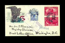 963 F Q5 image#Q5, 5c Parcel Post, centered a bit to bottom, along with a 1c Parcel Post (Q1) and a 10c Registration stamp (#F1), all tied to a stunning registered first day cover (for first class mail), prepared on an absolutely gorgeous multicolored Civil War patriotic cover, stamps cancelled by mute "Washington, D.C." double oval postmarks, excellent central strike of a violet boxed registration handstamp clearly showing the July 1, 1913 date, matching "Washington, D.C./July 1, 1913/Registered" double circle c.d.s. on reverse, very fine; serviced by the famous first day cover dealer Henry Hammelman, as part of a series of five Parcel Post covers he prepared (one of each denomination from 1c to 5c) on July 1, 1913 (see article in September-October 1964 issue of First Days); very few #Q5 first day covers exist in any form and none are more spectacular; 1986 PF certificate; ex-Persson, Doolittle. (Image) Est. 5,000-7,500