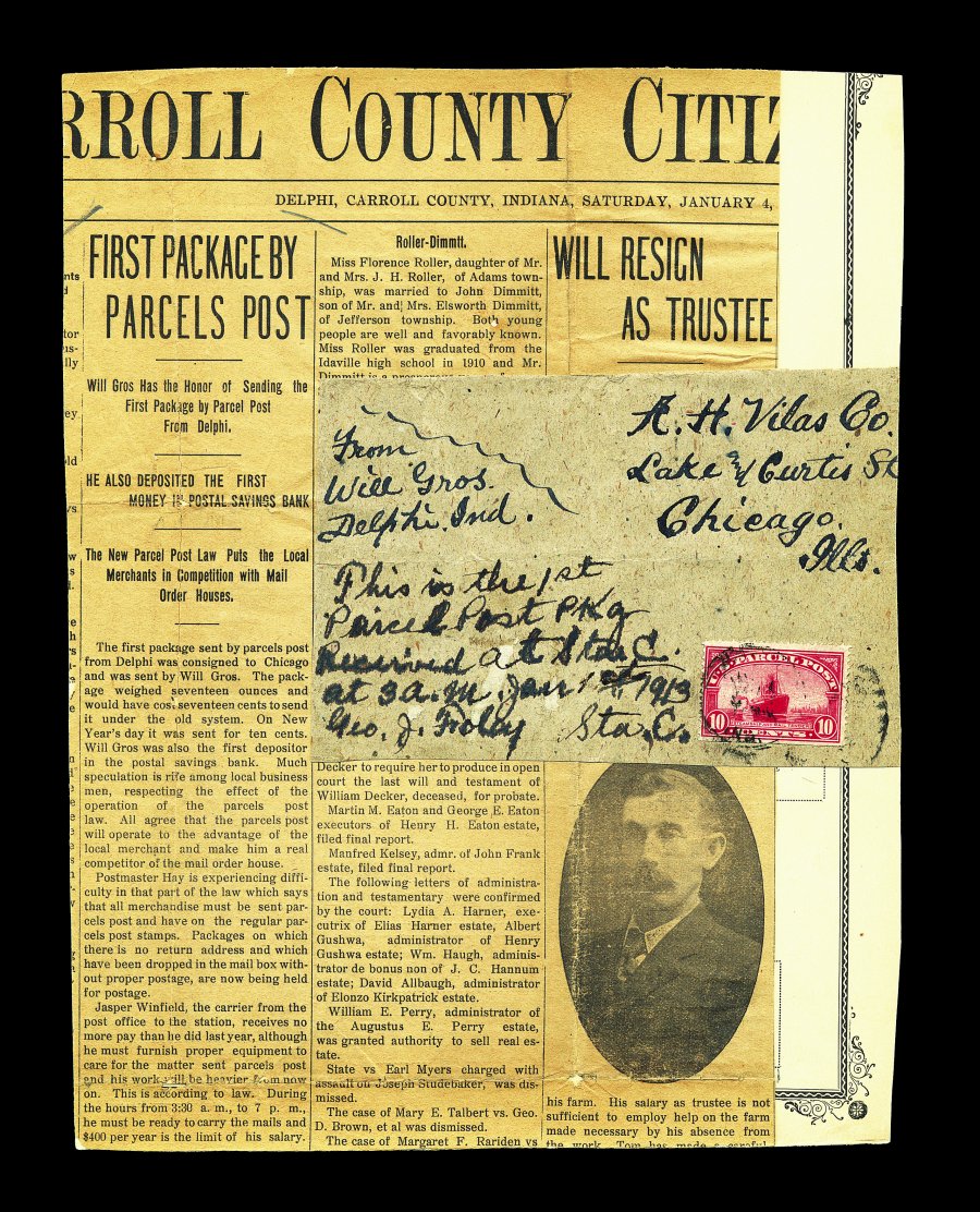 964 F Q6 image#Q6, 10c Parcel Post, natural s.e. at bottom, tied to large piece of original package wrapping by slightly blurred "Delphi, Ind./Jan 1, 1913" duplex postmark, this being the only recored Ten Cent Parcel Post January 1, 1913 first day cover (the very first day any of the Parcel Post stamps were available to the public), piece addressed to Chicago, Ill., and with bold manuscript notation "This is the 1st Parcel Post Pkg Received at Sta C at 3 A.M. Jan 1st, 1913/Geo. J. Foley"; piece has been affixed to large portion of the front page of the Carroll County Citizen newspaper dated January 4 (1913) which details the complete account of this package being the first to have been sent via parcel post with the new Ten Cent stamp; both the piece and news article are affixed to an old album page; a similar January 1, 1913 usage of the 5c value on a wrapper (from another town, but also accompanied by a documenting newspaper article) realized $10,000.00 in a fairly recent first day cover sale; a unique and historical artifact of tremendous importance to the Parcel Post specialist or serious first day cover collector; 1988 PF certificate. (image 964a) (Image) Est. 5,000-7,500