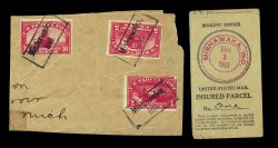 965 F Q6 image#Q6, 10c Parcel Post, tied to large portion of a parcel wrapper, along with singles of the 1c Parcel Post (#Q1) and 5c Parcel Post (#Q5) by boxed "Mishawaka/Ind." postmarks and addressed to Hanover, Mich., representing a very rare combination January 1, 1913 first day usage (the first day any of the Parcel Post stamps we available to the public), while there are no dated postmarks on the wrapper, there is ample evidence to prove the January 1, 1913 usage, including a detailed endorsement on the wrapper's reverse written and signed by the Assistant Postmaster of the Mishawaka Post Office which reads: "This wrapper enclosed the first parcel post package mailed in the United States under the parcel post system; at this office the receiving stamps are changed after 7 P.M. to the date of the following day. This package mailed at 10 P.M. on Dec. 31, 1912 one hour before Postmaster General Hitchcock mailed the first package in Washington, D.C."; further accompanied by the original "Insured Parcel" receipt which has a superb strike of a "Mishawaka, Ind./Jan. 1, 1913" c.d.s and receipt has been numbered "one" in manuscript; wrapper has been folded and has a couple of tears which have been repaired with tape, 10c stamp with small tear at top; one of the most fascinating and unique Parcel Post January 1, 1913 first day usages in existence. (Image) Est. 1,500-2,000