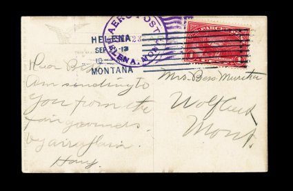 967 c Q1 image#Q1, 1c Parcel Post, intense color, tied to locally addressed picture post card by both "Helena/Sep 25-13/Montana" machine postmark and "Aeropost/Sep 23/Helena, Montana" violet flight cachet, being a very rare usage of the One Cent Parcel Post on a September 22-27, 1913 Helena, Montana, Driving Park Aviation Meet pioneer flight cover (AAMC #73), illustration on reverse is of the pilot for the flight, Miss Katherine Stinson, the first female in the history of U.S. aviation to carry mail, very fine; an important pioneer flight cover of the United States. (Image) Est. 1,000-1,500