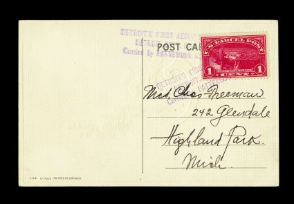 968 c Q1 image#Q1, 1c Parcel Post, rich color, tied to handsome greeting post card by two strikes of the three line "Detroit's First Aeroplane Mail/Detroit Sept. 6-14, 1915/Carried by Patterson Aviators" violet handstamp, being a very scarce September 6-14, 1915 Detroit, Michigan, State Fair Aviation Meet pioneer flight cover (AAMC #86), very fine; a most unusual usage of a Parcel Post stamp on an early pioneer flight cover. (Image) Est. 300-400