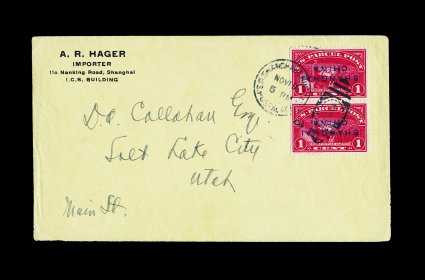 969 c Q1 var. image#Q1 var., 1c Parcel Post, with inverted Darrah "Shanghai/China" overprints in blue, vertical pair (natural s.e. at left), tied to cover to Salt Lake City, Utah by "Shanghai, China/ Nov 19/U.S. Postal Agency" 1914 duplex postmark, original enclosure accompanies, being a letter from an importer of engineering instruments and reads (in part) "Merry Christmas - Don't throw away the stamps that bring you this greeting as they may be interesting someday.", very fine and desirable; thought to be the only known cover bearing a legitimate usage of these rare inverted Darrah Shanghai overprints; ex-Doolittle where it realized $2,860.00 in the May 1989 sale conducted by Robert G. Kaufmann. (Image) Est. 2,000-3,000