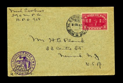 970 c Q3 image#Q3, 3c Parcel Post, well centered, tied to fresh cover to Newark, N.J. by "Postal Express Service/5 Mai./No. 918" American Expeditionary Forces c.d.s., purple A.E.F. violet censor handstamp at bottom left, an extremely fine and most unusual usage; illustrated on page 93 of U.S. Parcel Post - A Postal History by Henry M. Gobie; ex-Doolittle. (Image) Est. 300-400