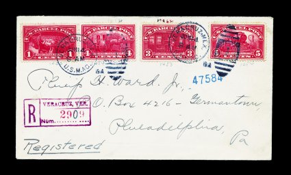 971 c Q1/5 image#Q1/5, 1c, 3c, 4c and 5c Parcel Posts, single of each tied to handsome registered cover to Philadelphia, Pa. by scarce "Vera Cruz, Mex./Jun 14, 1914/U.S.M.AG." duplex postmarks, boxed violet Vera Cruz registry handstamp at bottom left, violet Vera Cruz originating c.d.s. and Philadelphia arrival c.d.s. on reverse, exceptionally clean, choice very fine. (Image) Est. 300-400