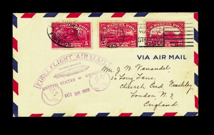 972 c Q5, 9, 11 image#Q5, 9, 11, 5c, 25c and 75c Parcel Posts, single of each tied to an attractive flown 1928 Graf Zeppelin cover by "Varick Street Sta./Oct 27, 1928" machine pmk., addressed to London, England, violet U.S.-Germany flight cachet, Friedrichshafen bkst., very fine; a most unusual usage of three different Parcel Post stamps used as regular postage on a Zeppelin flight cover. (Image) Est. 300-400