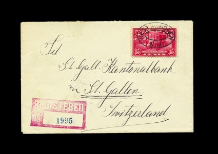 973 c Q7 image#Q7, 15c Parcel Post, fresh single with strong color, tied to neat registered cover to St. Gallen, Switzerland by "West Hoboken, N.J." double oval pmk., reddish violet box registry handstamp at bottom left, "New York/10-3, 1913" transit c.d.s. on reverse also happens to tie patriotic U.S. flag label which was used as a letter seal, very fine and most attractive. (Image) Est. 300-400
