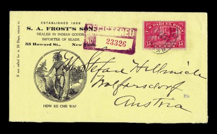 974 c Q7 image#Q7, 15c Parcel Post, rich color, tied to gorgeous illustrated Indian Goods importer corner card cover to Austria by "New York/S" double oval registry pmk., boxed violet "Registered" handstamp just to left, "New York Sta./Dec 9, 1913" originating c.d.s. on reverse, very fine; one of the most attractive of all known Fifteen Cent Parcel Post covers. (Image) Est. 400-500