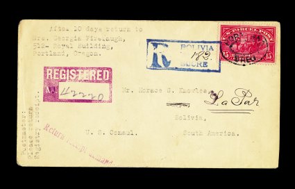 975 c Q7 image#Q7, 15c Parcel Post, nicely centered, tied to 1914 registered cover to La Paz, Bolivia by "Portland/Oreg." double oval postmark, as well as by the boxed registry handstamp of Bolivia, violet U.S. registry handstamp at far left, "Portland, Oregon/Jan 30, 1914" originating c.d.s. on reverse, along with New York transit c.d.s. and La Paz arrival c.d.s., very fine and quite scarce. (Image) Est. 300-400