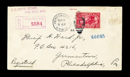 976 c Q7 image#Q7, 15c Parcel Post, well centered single, tied to handsome registered cover to Philadelphia, Pa. by very scarce "Vera Cruz, Mex./Sep 5, 1914/U.S.M.AG" duplex postmark, violet boxed Vera Cruz registry handstamp and matching three-line "U.S. Postal Agency,/Vera Cruz, Mex." just above, violet Vera Cruz originating c.d.s. and Philadelphia arrival c.d.s. on reverse, very fine; a seldom seen usage of the Fifteen Cent Parcel Post from Mexico. (Image) Est. 500-750