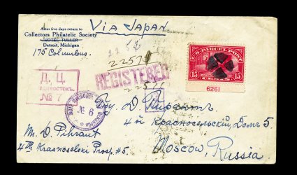 977 c Q7 image#Q7, 15c Parcel Post, bottom sheet-margin plate no. 6261 single, used on a Feb. 26, 1917 registered cover from Detroit to Moscow, Russia, stamp with central strike of a quartered cork pmk., violet "Registered" straightline handstamp and manuscript "Via Japan" on front, as well as a violet Russian censor circular handstamp, numerous markings on reverse including Detroit originating c.d.s., New York and Japanese transit c.d.s. and Moscow backstamps, very fine; a scarce cover full of character. (Image) Est. 300-400