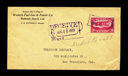 978 c Q8 image#Q8, 20c Parcel Post, natural s.e. at right, tied to "Western Fuel Gas & Power Co./Redondo Beach, Cal. corner card cover to San Francisco by boxed "Redondo Beach/Cal." postmark, handstamped "Received/August 26, 1913" upon arrival by addressee, cover with small fault on reverse and a couple of wrinkles, still a fine and rare usage of this value. (Image) Est. 400-500