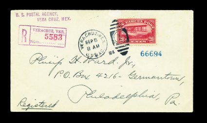 979 c Q8 image#Q8, 20c Parcel Post, fresh well centered single tied to an immaculate registered cover to Philadelphia, Pa. by choice strike of "Vera Cruz, Mex./Sep 5, 1914/U.S.M.AG." duplex postmark, violet Vera Cruz boxed registered handstamp and matching two-line "U.S. Postal Agency/Vera Cruz, Mex." just above, violet Vera Cruz c.d.s., as well as Philadelphia arrival c.d.s. on reverse, very fine; a very rare and exceedingly handsome usage of the Twenty Cent Parcel Post from Mexico. (Image) Est. 1,000-1,500