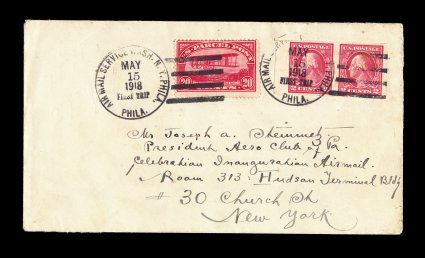980 c Q8 image#Q8, 20c Parcel Post, centered to top, tied to cover along with 2c carmine imperforate pair by two clear strikes of "Air Mail Service Wash. N.Y. Phila,/May 15, 1918/First Trip/Phila." handstamped cancels, addressed to the famous aerophilatelist Joseph A. Steinmetz in New York City, New York bkst., cover with vertical slit on back only, fine; a marvelous and very rare usage of the Twenty Cent Parcel Post, the first U.S. stamp to depict an aeroplane, on this famous first U.S. Governmental flight. (Image) Est. 1,000-1,500