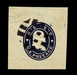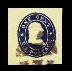 1070 O W25 image#W25, 1c Blue on manila wrapper, star die, impressive appearing used cut square, measuring a lavish 48x41mm, strong color on fresh clean paper, neat segmented cork postmark, some small faults which are endemic to most known examples (small thin spot and faint crease), nevertheless this is of extremely fine appearance and certainly the largest margined example of this rare cut square we have seen. (Image) 2,000.00