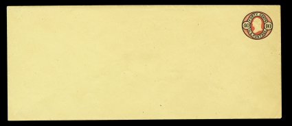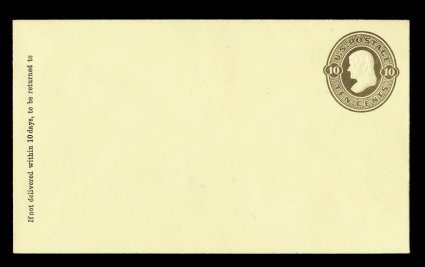 1099 ogc U90 image#U90, 10c Olive black on amber, die 39, size 7, knife 25, wmk. 2, an exceptional quality mint entire, with vertical printed return address as always, marvelously fresh and bright, superbly detailed embossing on immaculate paper, extremely fine; especially scarce and desirable this choice (UPSS #226a). (Image) 1,250.00