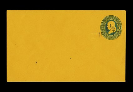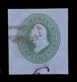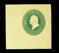 1138 O U170 image#U170, 3c Green on blue, used cut square, 35x38mm, lightly cancelled, small closed tear at top extends just to top of embossment, very fine appearance for this, one of the rarest cut squares of the period, with only two used cut squares that have been certified, and perhaps no more than five or six in total known; 1998 PF certificate. (Image) 3,500.00