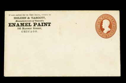 1130 ogc U134 image#U134, 2c Brown on white, die 51, size 6, knife 18, wmk. 2, attractive example of this rare mint entire, with "Holden & Tascott/Enamel Paint" printed return corner card at top left as sometimes found, strong embossing, clean and very fine; ex-White (UPSS #309). (Image) 1,750.00