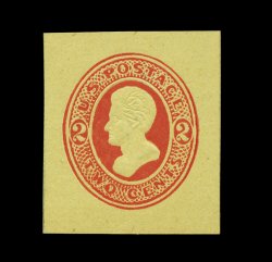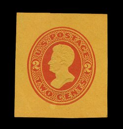 1133 og U137B image#U137B, 2c Vermilion on amber, mint cut square, being a full corner example measuring 32x38mm, quite fresh and clean, trivial slight surface abrasion at right from erasure, of little importance considering this cut square's unique status, very fine; Scott #U137B is one of the greatest rarities not only in the field of postal stationery, but in all of United States philately, as only this cut square, and one other, as well as a single entire are thought to exist (although some experts question whether an entire does indeed exist), an example of this cut square has not appeared at auction in over three decades, therefore the current catalog value is, in our opinion, of little relevance to its actual market value, since the editors have the Scott catalog have not had the benefit of recent auction realizations upon which to base a more accurate price; recent auction realizations of cut squares that are known in "quantities" of three to five have been realizing in excess of $50,000.00; 1995 PF certificate. (Image) 25,000.00