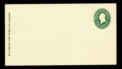 1187 ogc U318 image#U318, 2c Green on white, die 89, size 10, knife 54, wmk. 7, wonderfully clean mint entire, with vertical printed return instructions at far left as usual, crisp embossing and edges, extremely fine (UPSS #1042). (Image) 190.00