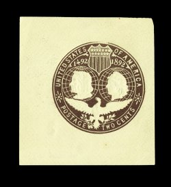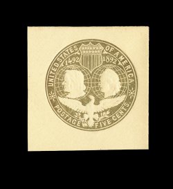 1195 og U350a image#U350a, 5c Columbian, slate brown on white error of color, choice mint cut square, being a full corner example which measures a wonderfully well balanced 46x47mm, incredibly fresh and bright, extremely fine. (Image) 800.00