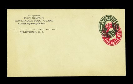 1197 ogc U411h image#U411h, 2c Carmine with added impression of 1c Green (#U400), Die 115, size 8, knife 41, wmk. 15, mint entire, with return address corner card, small piece of flap missing, otherwise very fine; a scarce and striking error (UPSS #1634a). (Image) 325.00