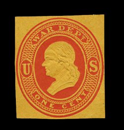 1292 og UO45 image#UO45, 1c Red War Dept. on amber, mint cut square, 33x37mm, particularly fresh, with strong detailed embossing, a very fine and choice example of this rare cut square of which no entires are known. (Image) 900.00