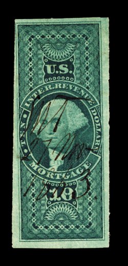 1322 O R95a image#R95a, $10.00 Mortgage, imperforate, very large margins all around except a little closer at top left, deep rich color, ms. cancel, very fine. (Image) 450.00