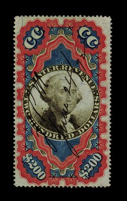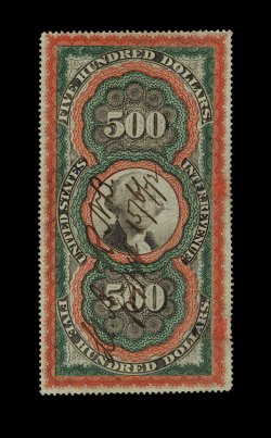 1323 O R132 image#R132, $200.00 Red, blue and black, "Small Persian Rug", gorgeous rich colors, nicely centered, neat 1872 ms. cancel, tiny thin spot and mild corner crease, otherwise a very fine example of this popular revenue. (Image) 5,000.00