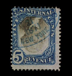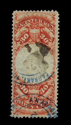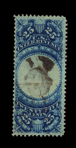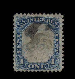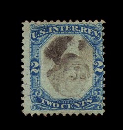 1329 O R111a image#R111a, 20c Blue and black, Inverted Center, a highly desirable used example of this exceptionally rare invert, of which only 13 singles are known to exist, (plus one pair), fresh rich colors, centered to top left but actually better centering than most, as nearly all have its design well cut by the perforations, light blue herringbone cancel which may just barely cut the paper in one place, a fine example of the rarest inverted center from the second issue revenues; ex-Joyce. (Image) for fine 8,000.00