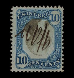 1328 O R109a image#R109a, 10c Blue and black, Inverted Center, uncommonly rich colors and a strong impression, far better centering than most examples, neat ms. cancel, light horizontal crease, otherwise very fine; approximately 52 examples of this invert have been recorded. (Image) for fine 2,000.00