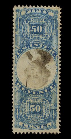 1331 ng R115b image#R115b, 50c Blue and black, Inverted Center, a highly select unused example of this invert, being exceptionally well centered within large margins, rich color, still with traces of original gum, extremely fine; choice certified unused examples of any of the revenue inverts are quite rare and highly desirable; 1992 PF certificate. (Image) for used 850.00