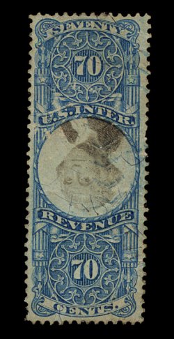 1332 O R117a image#R117a, 70c Blue and black, Inverted Center, outstanding centering which is most uncharacteristic of this invert, strong color and impression, blue herringbone cancel breaks the paper in a few places, small thin spot a couple trivial facial scrapes, very fine appearance; this is only the 27th recorded example of this inverted center, of the other 26 recorded in the Lyons census, only 2 have very fine centering such as this one. (Image) 3,500.00
