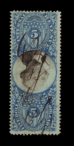 1334 O R127a image#R127a, $5.00 Blue and black, Inverted Center, lovely rich colors, ms. cancel, faintest trace of creasing, otherwise nearly very fine; a handsome example of this rare inverted center; ex-Joyce. (Image) 3,000.00