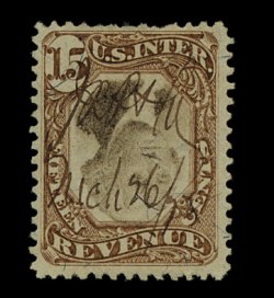 1324 O R133 image#R133, $500.00 Red orange, green and black, "Large Persian Rug", strong rich colors, neat 1872 ms. cancel, two small repairs at right, very fine appearance; a very presentable example of this celebrated high value. (Image) 13,000.00