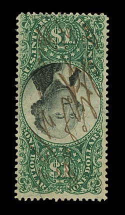 1338 O R144a image#R144a, $1.00 Green and black, Inverted Center, sumptuously rich colors, neat ms. cancel, a couple really trivial flaws (virtually every example of this invert has faults to some degree), still fine; this is one of only 22 examples recorded in the Lyons census, and is actually one of the more attractive and desirable copies available; 1984 PF certificate; ex-Anderson. (Image) 5,500.00