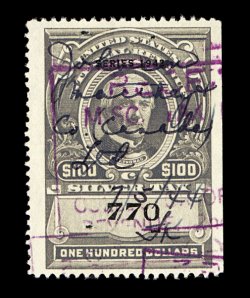 1441 O RG105 image#RG105, $100.00 Gray, Series 1942, used, light boxed violet handstamp and neat manuscript cancels, well centered, strong rich color on bright paper, pair of neat staple holes which are quite typical of these, choice very fine. (Image) 500.00