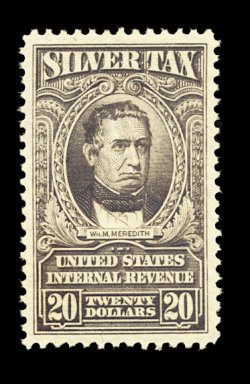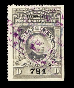 1442 O RG106 image#RG106, $500.00 Gray, Series 1942, an exceedingly handsome and choice used example of this enormously rare stamp, being one of only six in existence according to our records, incredibly well centered within extravagantly large margins, strong rich color on bright paper, light boxed violet handstamp and manuscript cancels, neat pair of staple holes as is typical on the Silver Tax high values, extremely fine; ex-Wampler. (Image) 3,500.00