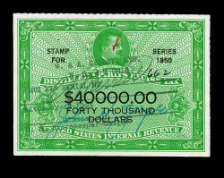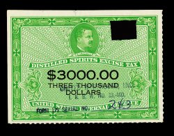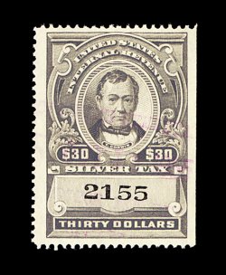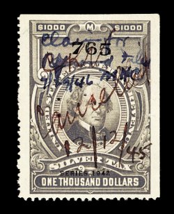 1446 ogO RG1/132 #RG1/132, Desirable balance of the Silver Tax stamp collection, containing 64 different mint and used stamps, includes a very nice used set of the 1934 First Issues through the $1,000.00, all uncut (the $1,000.00 value with a vertical crease), other stamps include the Series 1941 overprints complete through the $10.00, plus a $100.00 value (mixed mint and used), a set of the 1944 unoverprinted series to the $10.00, plus the $50.00 through $1,000.00 high value (a few of these have either staple holes or cut cancels), some stamps with small faults, but a great number are fine-very fine; a seldom offered lot of these popular and elusive stamps. 3,000.00+