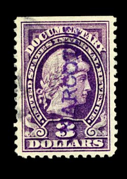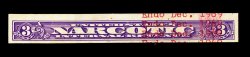1448 O RJA23 image#RJA23, $3.00 Violet, with "Narcotic" overprint in violet reading vertically, very scarce certified used example, light strike of an oval handstamp cancel, well centered, natural s.e. at top, small corner crease at top left, otherwise very fine; certified examples of this are almost unheard of; 1991 PF certificate. (Image) 1,200.00