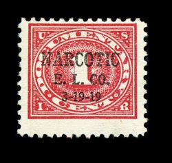 1451 O RJA26 image#RJA26, 1c Carmine rose, with "Narcotic/E.L. Co./3-19-19" overprint, a seldom seen sound example of this exceedingly rare stamp which was overprinted by Eli Lilly Co. for their own use, wide margins, fresh color, fine; only a small number are known. (Image) 2,250.00