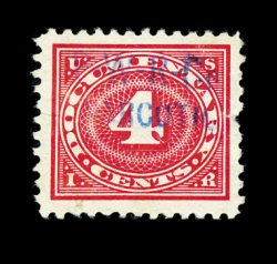 1452 O RJA28A image#RJA28A, 4c Carmine rose, with "P-W-R-Co./Narcotic" blue handstamp overprint, used as always, very light blue handstamp and removed pen cancels, exceptionally well centered, small margin defect at right, extremely fine centering; only the second certified example we have ever seen of this rare stamp. (Image) 1,200.00