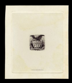 145 E 116-E4 image#116-E4, 10c Black die essay on India, showing heavy shading in "0" of "10", 61x73mm die sunk on 78x91mm card, very fine; an especially rare Ten Cent 1869 Pictorial essay showing the full die sinkage. (Image) 2,500.00
