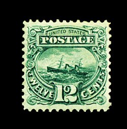 147 og 117 image#117, 12c Green, outstanding mint example, possessing absolutely flawless centering within large margins, gorgeous rich color and a crisp detailed impression further enhance this exceptional stamp's overall appeal, full clean o.g. that has been only lightly hinged, extremely fine; a gem original gum Twelve Cent 1869 Pictorial that is certainly among the very finest known; 1991 PF certificate; ex-Billington. (Image) 2,250.00