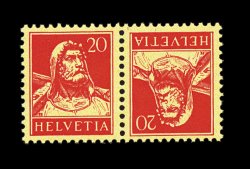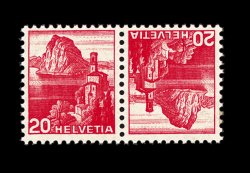 1584 nh K35y.1.09 imageZumstein #K35y.1.09, 1942 20c Red on thin transparent paper, tete-beche pair, very fresh, o.g., n.h., very fine; an elusive tete-beche pair. (Image) 1,600SF