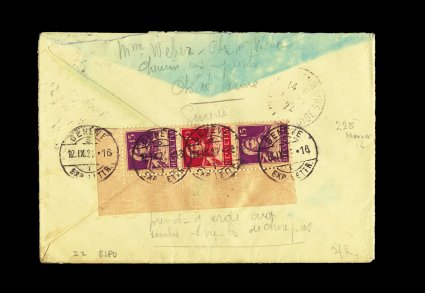 1585 c Z2 imageZumstein #Z2, 1914 10c Red, 15c Violet, se-tenant strip of three, top left sheet margin vertical strip, the middle stamp being the 10c value, tied by "Geneve/Exp. Lettr./12.IX.22" c.d.s. postmarks on back of cover to France, front of cover with small surface scrapes, stamps very fine. (Image) 900SF