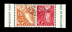 1582 O K25z imageZumstein #K25z, 1933 20c Carmine red on ribbed paper, tete-beche pair, tied to piece by "Zouz/Graubunden/23.IX.35" c.d.s., stamp has been lifted for examination and hinged into place, some of the perfs. have been reattached, very fine; the scarcest of all the tete-beche pairs; 1974 Nussbaum certificate. (Image) 3,200SF